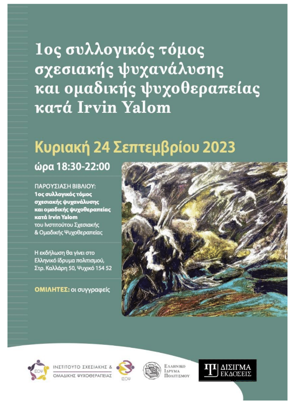 Στις 24 Σεπτεμβρίου2023,Κυριακή ,18.30-22.00 η πολυμελής ομάδα του Ινστιτούτου Σχεσιακής και Ομαδικής ψυχοθεραπείας θα παρουσιάσει το πρόσφατο μας βιβλίο ,1ος συλλογικός τόμος σχεσιακής ψυχανάλυσης και ομαδικής ψυχοθεραπείας κατά Irvin Yalom.Οι συγγραφείς του βιβλίου θα μιλήσουν επί σκηνής μεταξύ τους μαζί με Τακτικά και Δόκιμα Τακτικά Μέλη του Ινστιτούτου μας, σχολιάζοντας κείμενα του κάθε συγγραφέα μέσα από το βιβλίο. Αφού ολοκληρωθούν αυτοί οι δυαδικοί διάλογοι , στη συζήτηση θα συμμετάσχει το κοινό όπως πάντα με ερωτήσεις προς τους συγγραφείς και τους ομιλητές. Στο τέλος οι συγγραφείς θα υπογράψουν αντίτυπα του βιβλίου. Η παρουσίαση του βιβλίου θα συνοδευθεί από εδέσματα. Καθώς έχουν ήδη κλειστεί οι πρώτες 200 θέσεις από τις 250 προσφερόμενες, η δήλωση συμμετοχής μπορεί να γίνει μόνο online στην παρακάτω φόρμα Και θα ακολουθήσουν 3 διαφορετικές επιβεβαιώσεις αποκλειστικά διαδικτυακά.
